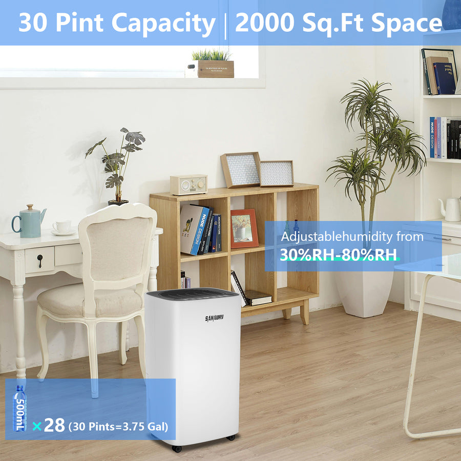SAHAUHY 2000 square foot basement dehumidifier, portable dehumidifier suitable for home garage bedrooms with drainage hose, 0.52 gallon water tank and wheels