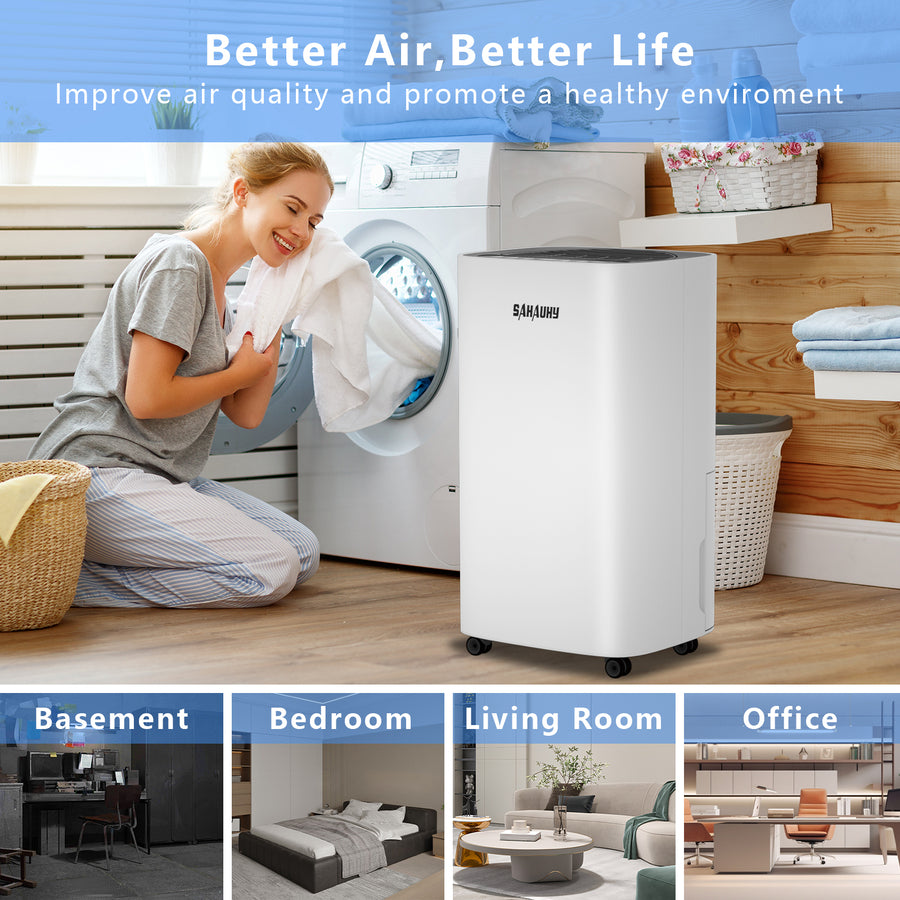 SAHAUHY basement dehumidifier can remove 30 dehydrated (90% RH @ 90 degrees Fahrenheit) water samples per day and adjust the humidity from 80% to 30%, creating a more comfortable environment for you. Suitable for any home, basement, bedroom, kitchen, office, bathroom, storage area, store, living room, laundry room, basement, crawl space, etc.