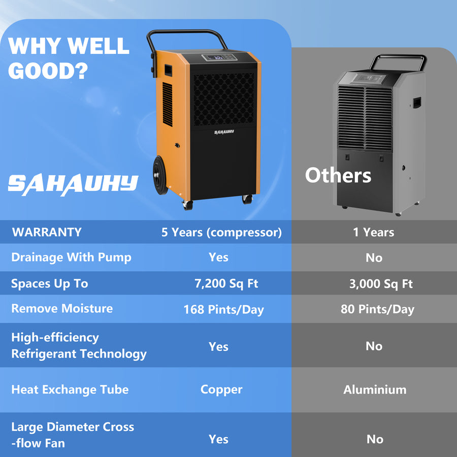 - 【Powerful Dehumidification】This commercial dehumidifier quickly and effectively removes 168 Pints/Day(under 95°F, 90%RH condition) water per day,spaces up to 7200 sq.ft,adjusts to your preset humidity level from 90% to 10% for optimal indoor humidity,it is one of the best choice to improve your living environment.