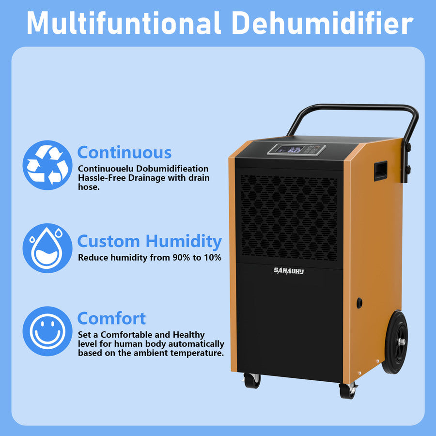 - 【Intelligent Control 】High-performance Basement Dehumidifier with Pump and 16.4 feet Drain Hose- Featuring with automatic humidistat system,timer, automatic restart after power outages,auto defrost, continuous drainage,it works well for urgent water damage restoration, fast structural drying, and other jobs that require fast dry.