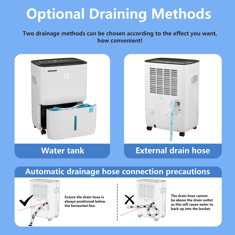 - PORTABLE DRAINAGE: This dehumidifier comes with 3.3ft drain hose for continuous draining. If you think the hose is not long enough, - It can also connect to the garden hose(Buy Separately).